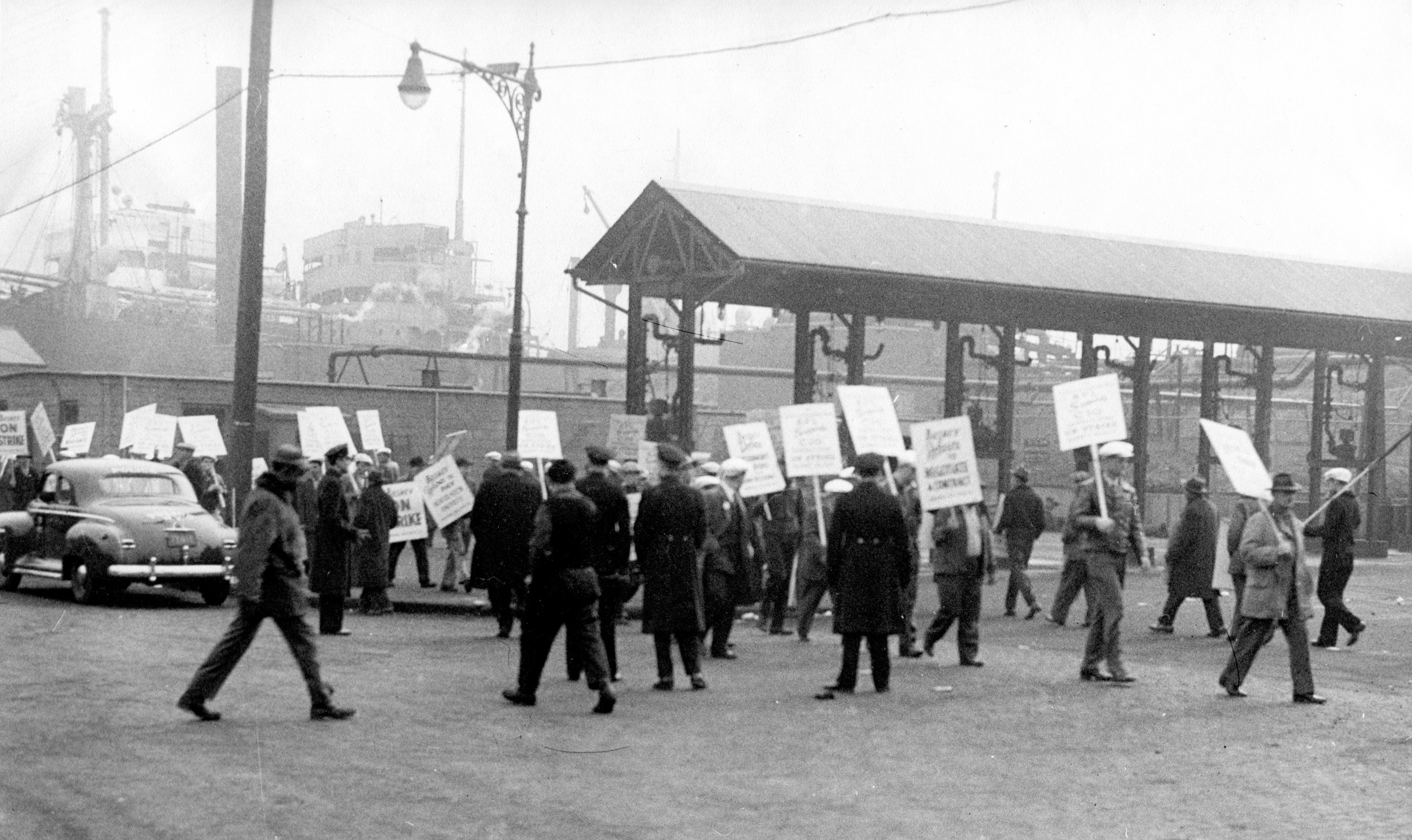 "The SIU signs stand out. This close-up of the picketline shows CIO shipbuilders and AFL seamen marching side by side. That's real unity."