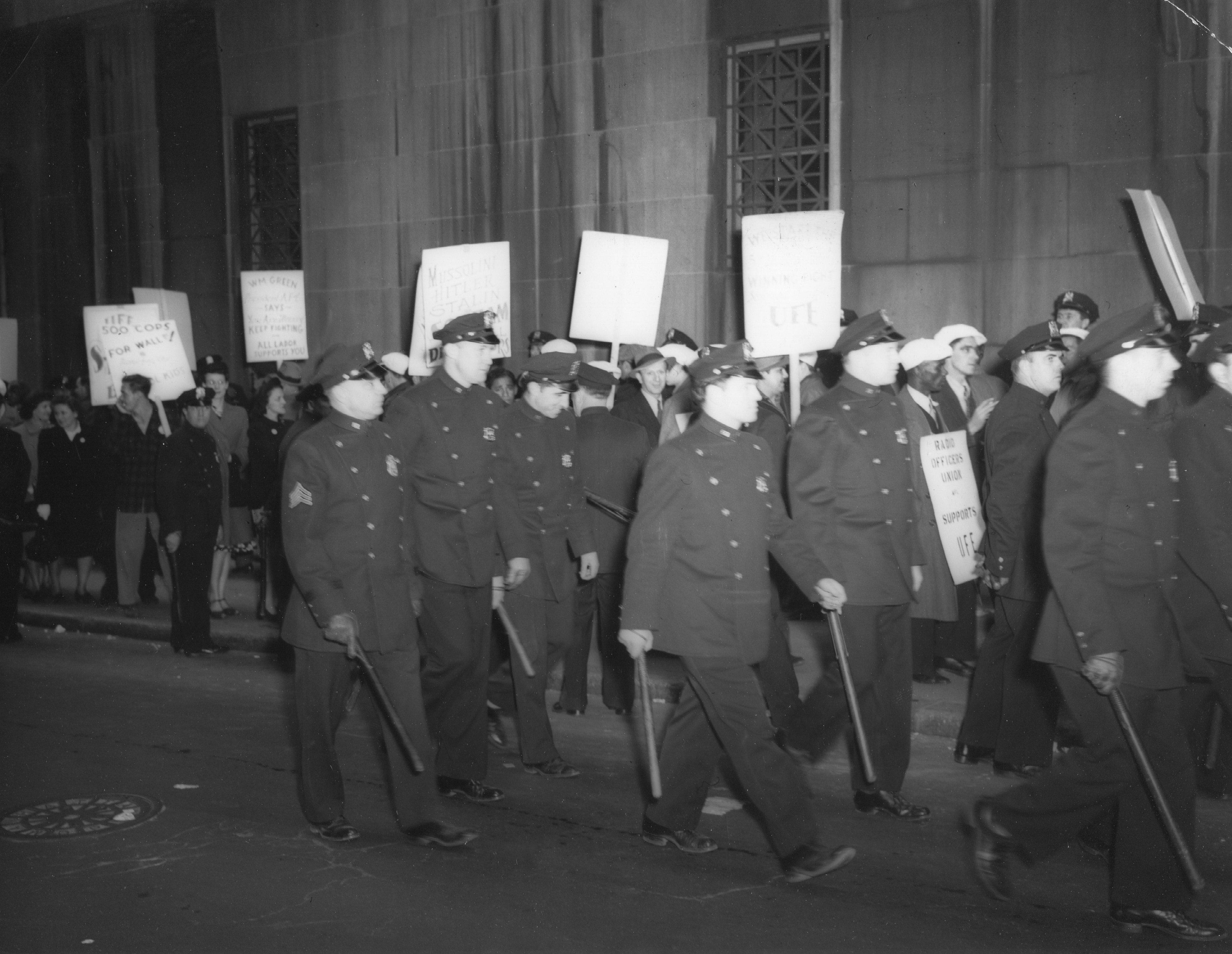 Police responded to the UFE Wall Street strike with a heavy presence. Ostensibly, they were sent to protect picketers from dangerous Financial District traffic. In reality, they were protecting the interests of the Wall Street bosses. Many picketers were met with police violence during the course of the demonstration.