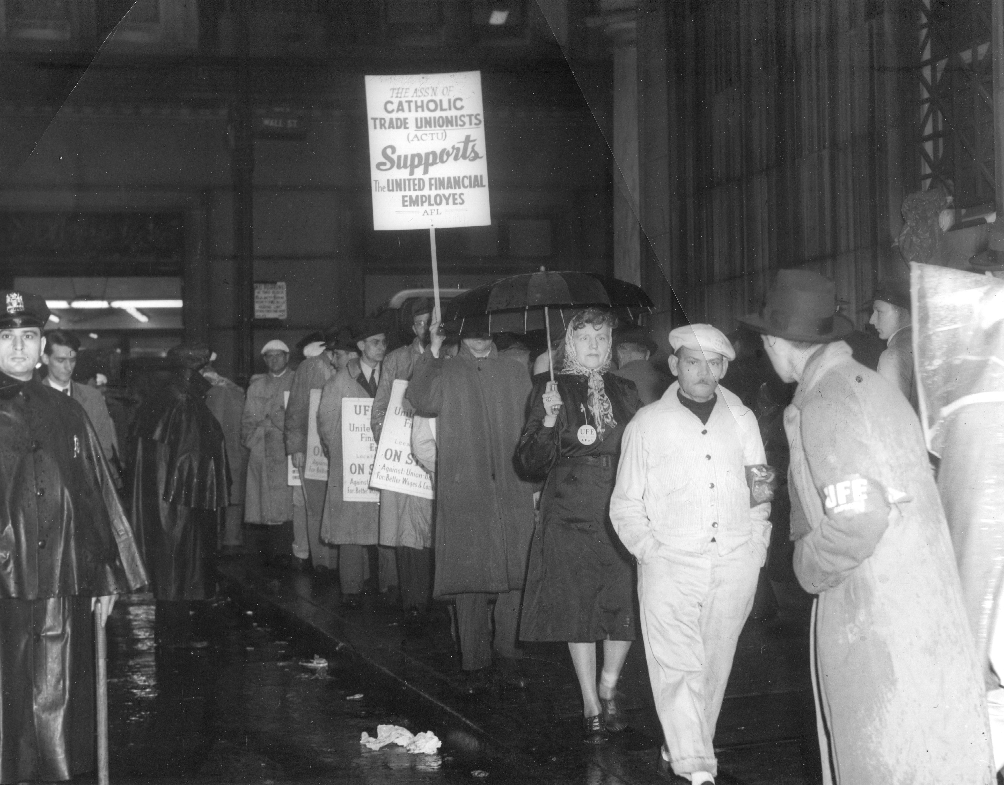 As an expression of solidarity, members of the progressive, anti-communist Association of Catholic Trade Unionists (ACTU) march with the UFE, SIU, and SUP against the New York Stock Exchange.