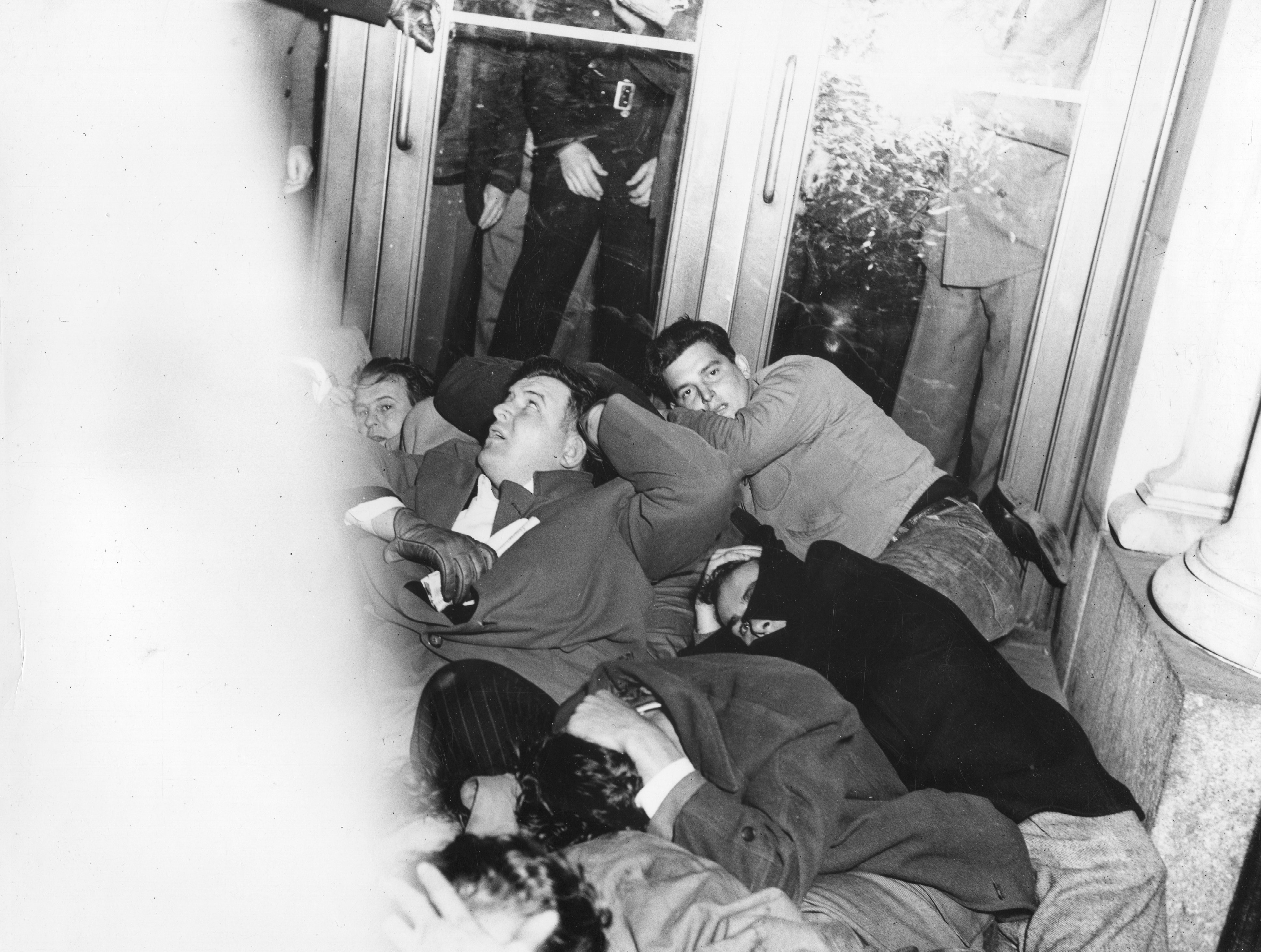 Protecting themselves from police violence, the picketers crouch on the ground and cover their faces.