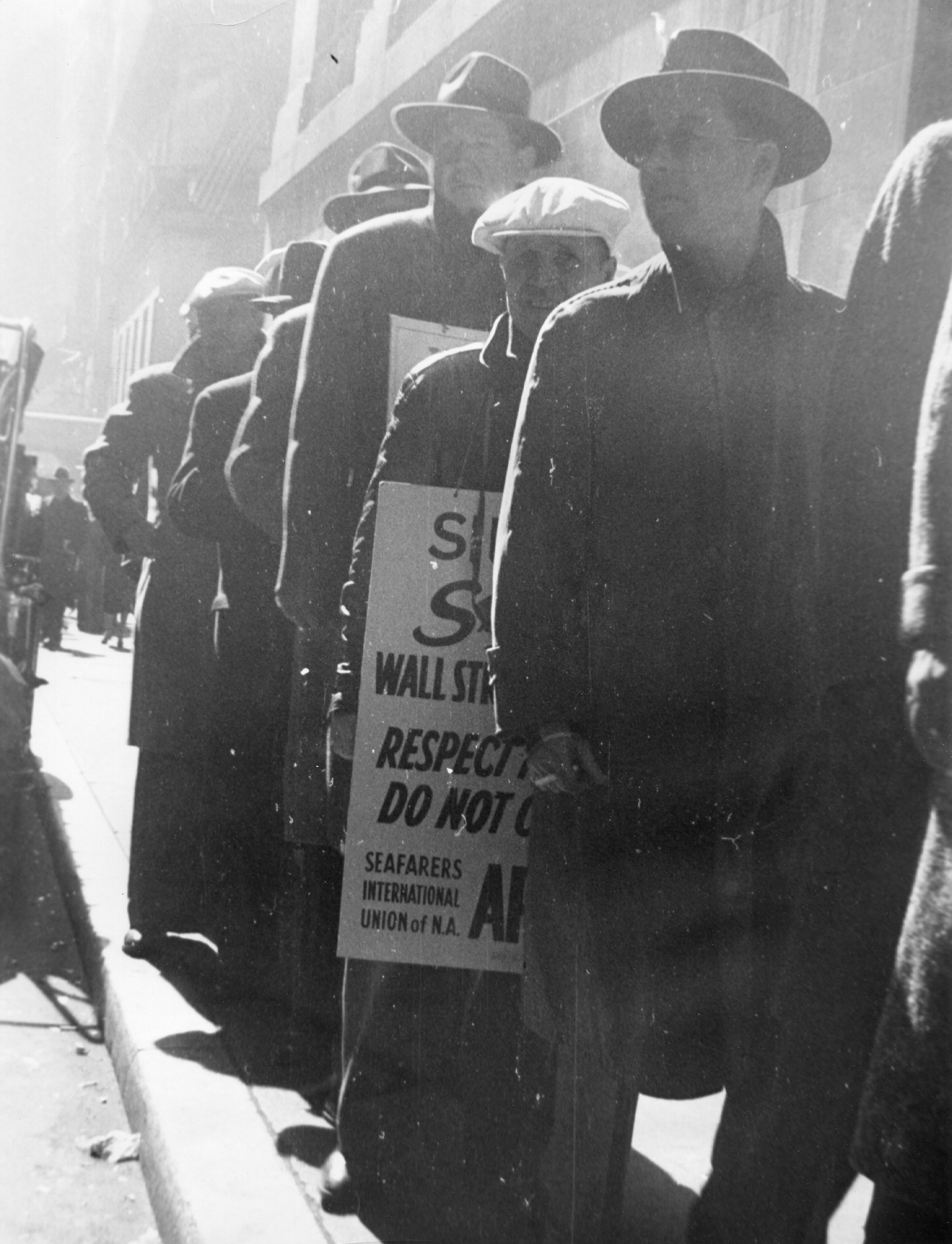 While it was not always a hard and fast rule, the UFE strikers wore Trillby hats and their SIU allies wore white caps. As you can see, members of both organizations are represented in this picture.