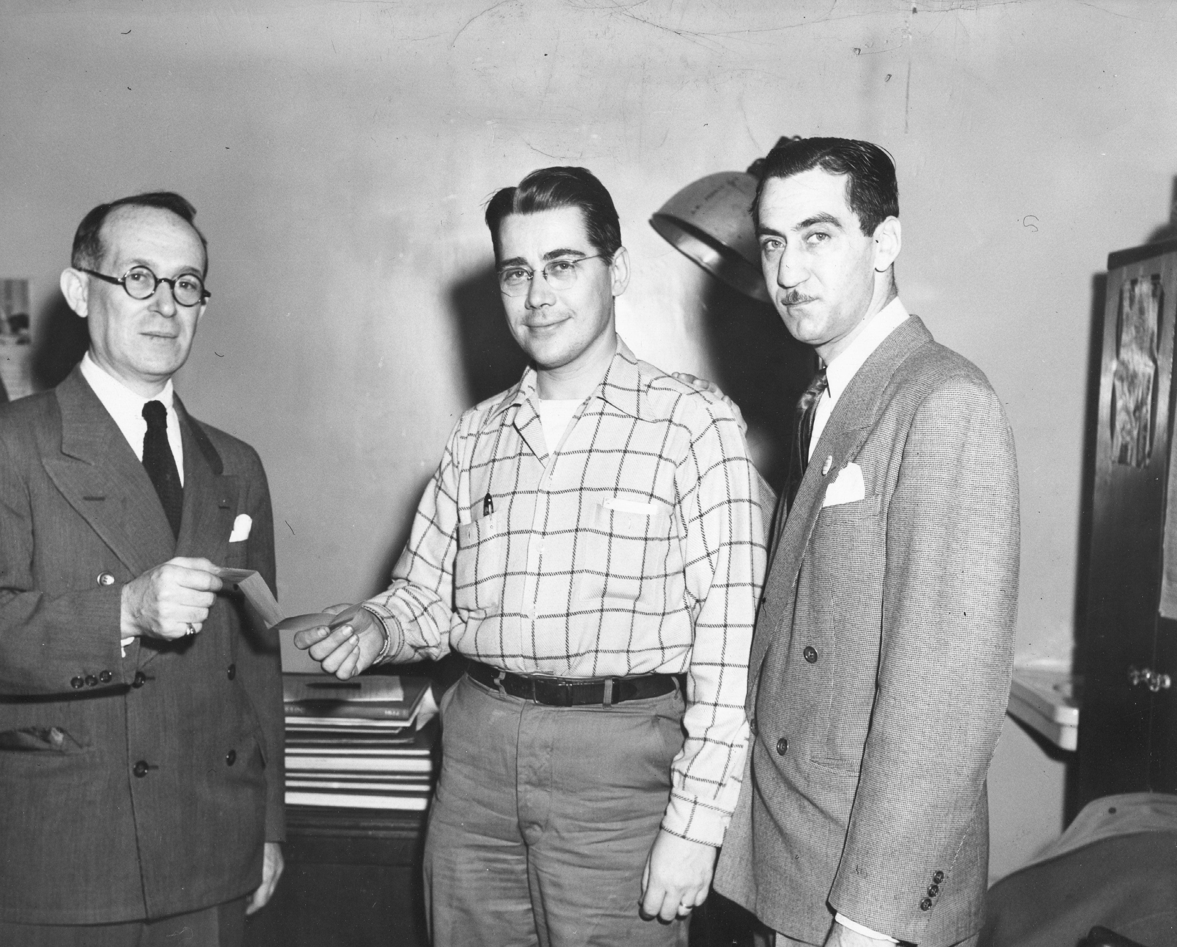 Union of Care Employees President Sam Kaufman (left) and Vice President Nat Klein (right) present a check for $150.00 to UFE President M. David Keefe (center) for strike assistance. UCE also contributed 10 percent of their membership dues to the striking financial workers.
